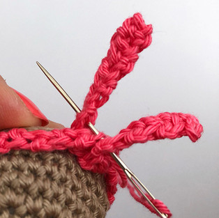 Use Catona 253 (Tropic) to work the scarf. Weave in ends but do not stitch it onto the head just yet. Just tie in on in place. Using Catona 410 (Rich Coral), embroider 7-8 stitches around one end of the scarf. Add a line of running stitches along the length of the scarf, securing the scarf to the head as you do so. Embroider the other end of the scarf with stitches then weave in all ends.